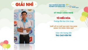 ![]() Sinh viên Tô Hiếu Hòa – sinh viên Khoa Kỹ thuật Công nghệ đạt Giải Nhì cá nhân lĩnh vực Kỹ thuật Công nghệ (không có giải Nhất lĩnh vực này), tại giải thưởng sinh viên Nghiên cứu khoa học_ Eureka lần thứ 21 năm 2019 với đề tài dự thi là Máy thu gom và đánh tơi phân trùng quế. (GV hướng dẫn: ThS. Cao Văn Thi). |