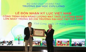 ![]() Nhà máy điện năng lượng mặt trời tại trường Đại học Cửu Long được Hội đồng Xác lập Kỷ lục Việt Nam trao giấy chứng nhận kỷ lục là công trình điện năng lượng mặt trời có công suất lớn nhất trong số 236 trường đại học trong cả nước |