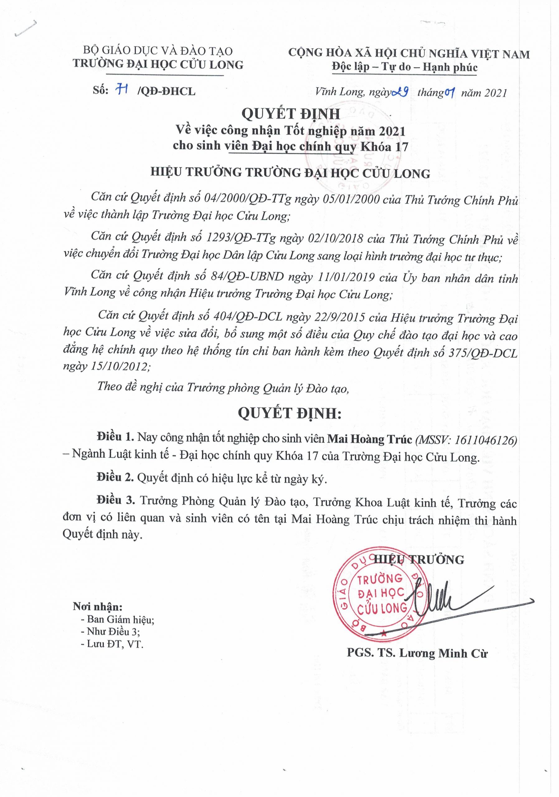 Quyết định công nhận tốt nghiệp ngày 29/01/2021