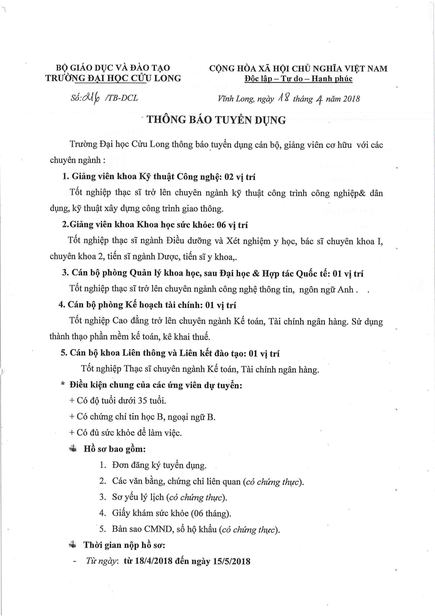 Thông báo tuyển dụng nhân sự (Số 216/TB-ĐHCL, ngày 08/4/2018)