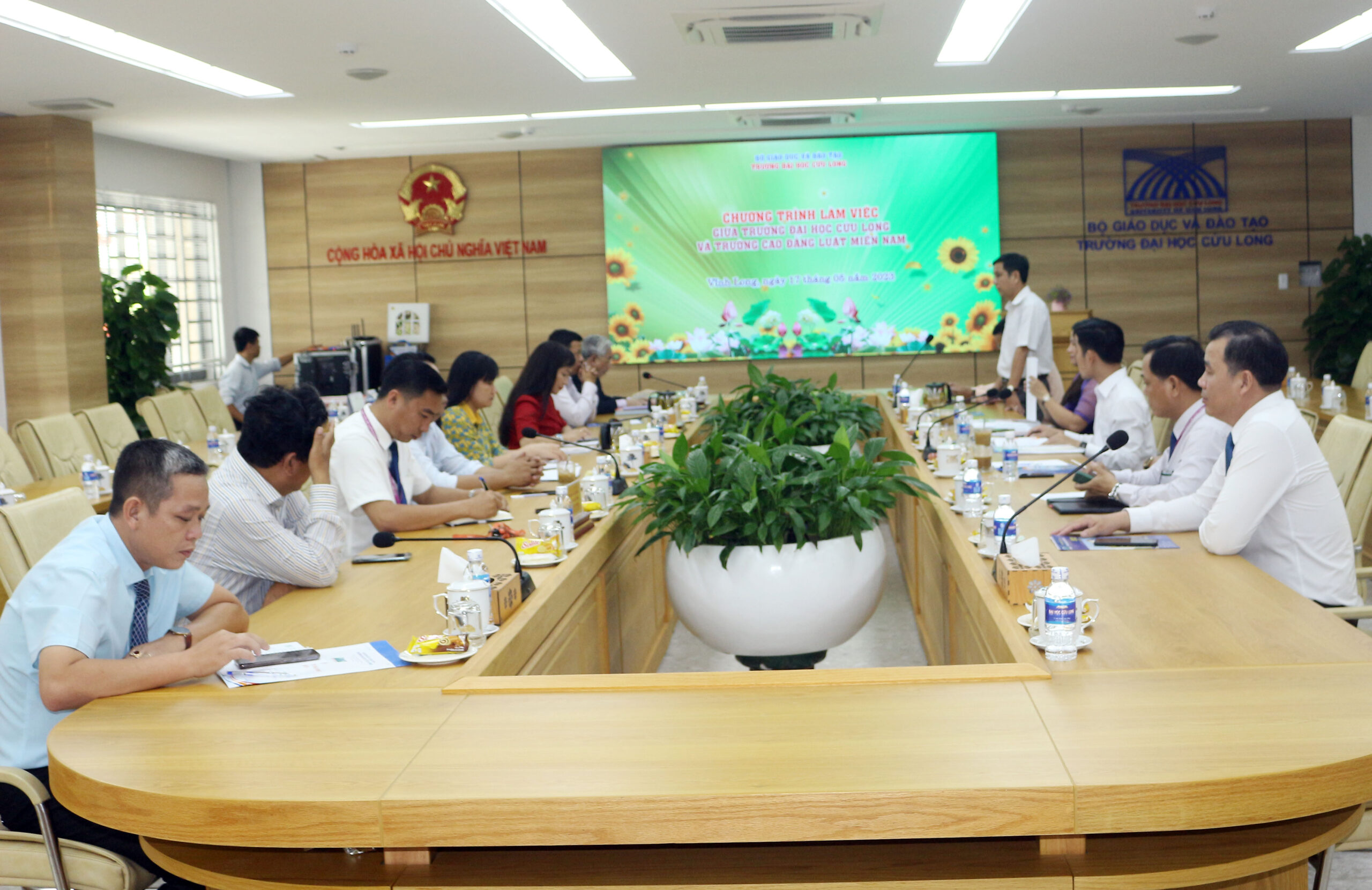Ngày 17/5/2023 lãnh đạo Trường ĐH Cửu Long (ĐHCL) có buổi tiếp và làm việc với lãnh đạo Trường CĐ Luật Miền Nam về hợp tác trong lĩnh vực giáo dục và đào tạo.